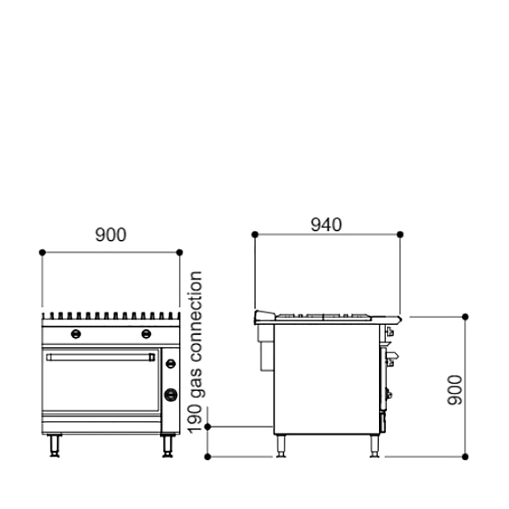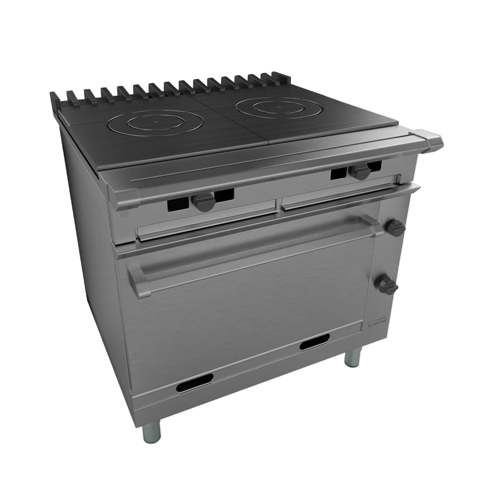 Oven is supplied with anti-tilt shelves and controlled by Peizo ignotion; all burners have failure device.Precise temperature control; oven controlled by direct acting thermostat. All gas appliances should be fitted by a qualified commercial catering ‘GasSafe’ engineer under a gas interlocked canopy.