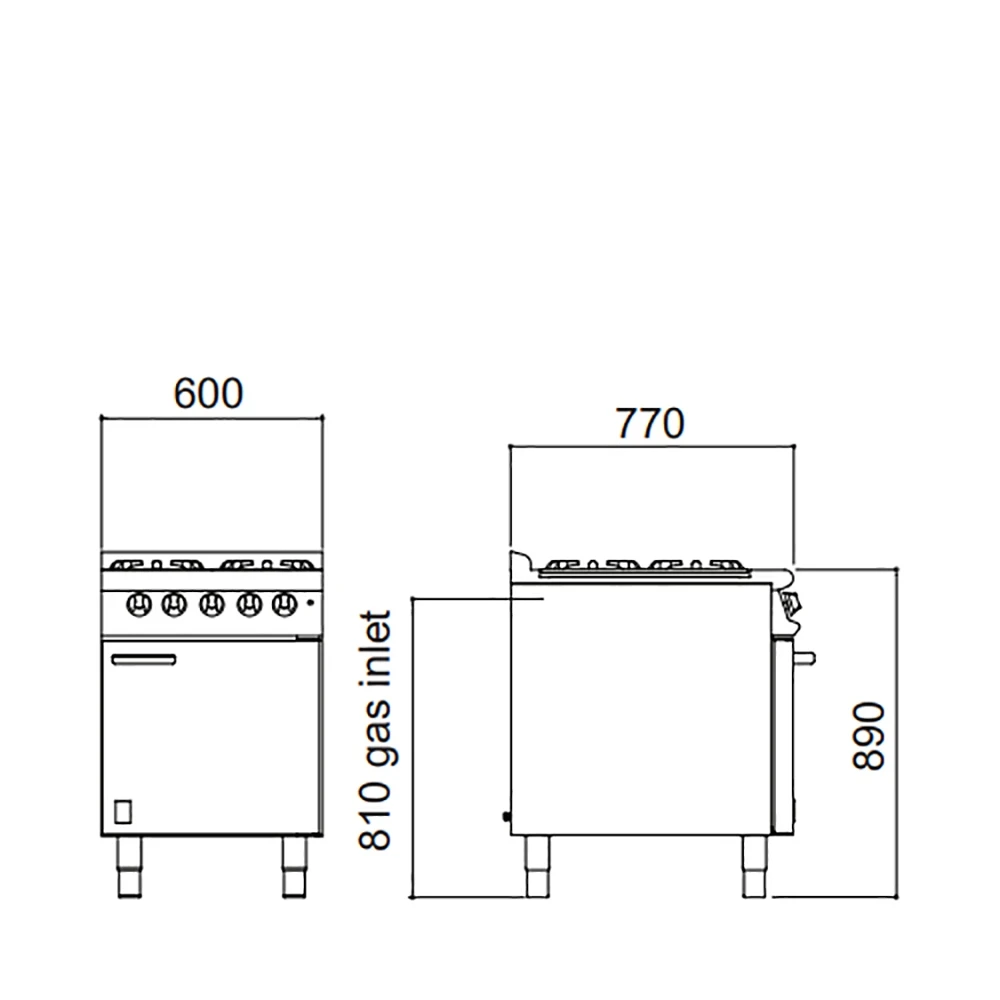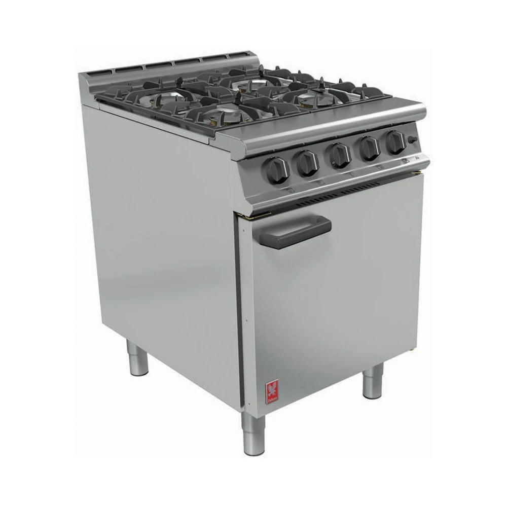 Individual cast iron pan supports on open top units. Vitreous enamelled oven chamber. Oven has five shelf positions for two shelf cooking. All gas appliances should be fitted by a qualfied commercial catering ‘GasSafe’ engineer under a gas interlocked canopy.