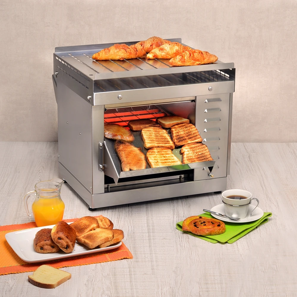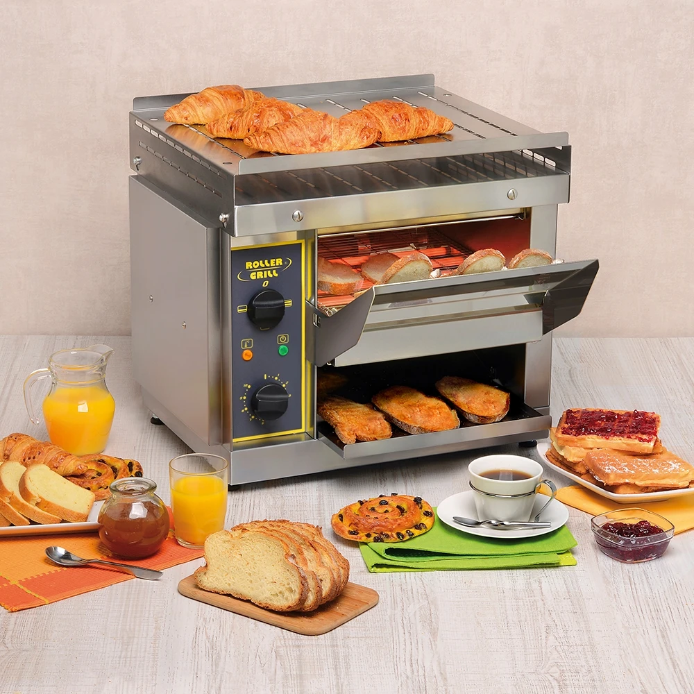 Roller Grill CT540 is ideal for breakfast buffet, this heavy duty versatile conveyor toaster toasts everything waffles, bagels to muffins and even from bread to buns with an optimal output of 300 – 540 pieces per hour according to the thickness of bread with no pre-heating. Both sets of 4 infrared quartz elements are individually controlled as well as the speed of the conveyor belt to give the desired result every time. The back can be removed for front or pass through operation: Front operation to toast bread, brioche, bagels etc. Pass through operation to toast baguettes, garlic bread, small pizzas etc.